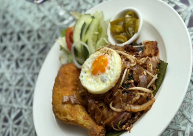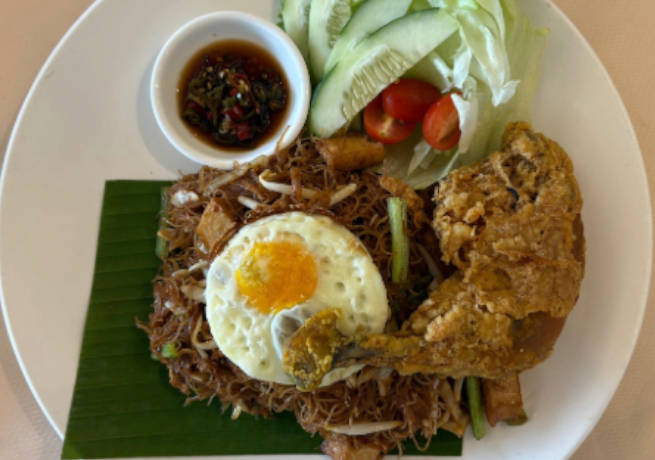 Fried Rice Vermicelli with Whole Leg. Chicken and Fried Egg.