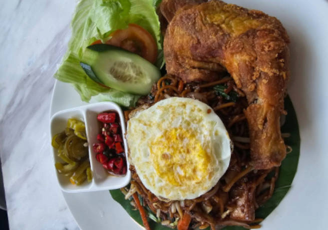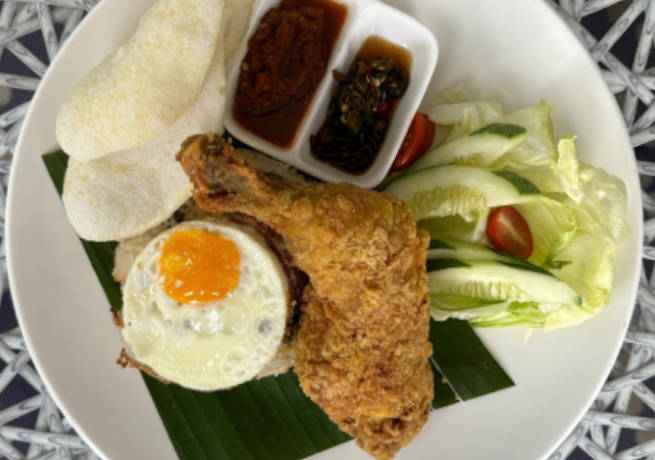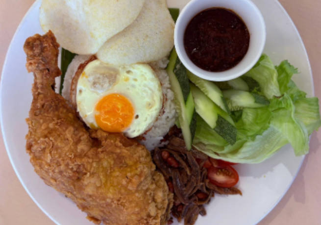 Coconut Rice Served with Spicy Sweet Sambal Sauce, Peanuts, Anchovies, Fried Egg and Fried Whole Leg Chicken.