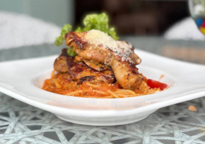 Grilled Chicken Thigh; Served with Pasta and Coulis Sauce.